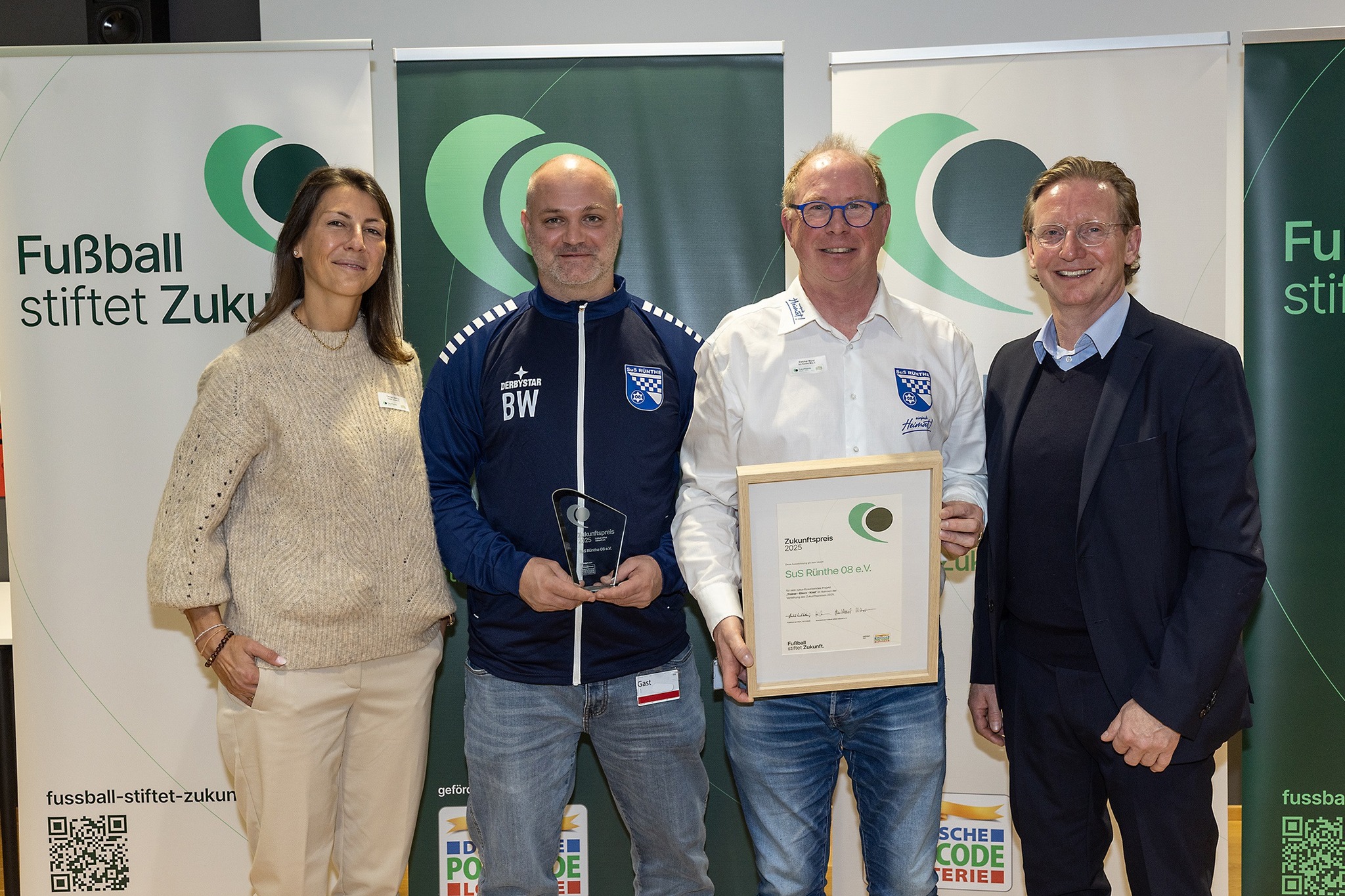 Wenn ein kleiner Verein Großes bewegt, dann ist es der SuS Rünthe 08 e. V. Am 18. November 2025 wurde unser Verein auf dem DFB-Campus in Frankfurt erneut mit dem Zukunftspreis „Fußball stiftet Zukunft“ ausgezeichnet – und das bereits zum zweiten Mal in drei Jahren. Eine deutschlandweit einzigartige Leistung.